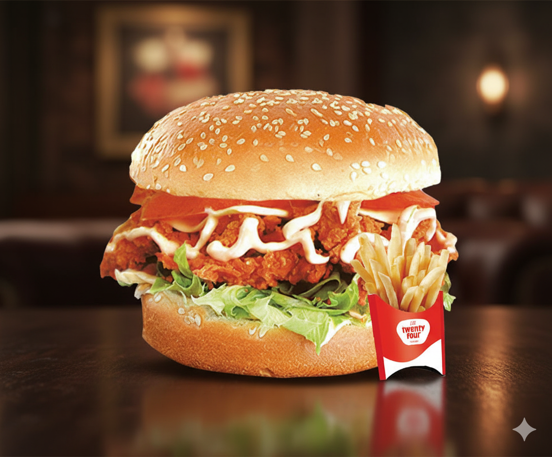 Discover a bold fusion of flavor with our Calzoni Burger, a unique creation that blends Italian-inspired richness with classic burger comfort. Featuring a juicy chicken fillet, melted mozzarella cheese, and our special Calzoni sauce, it’s layered with lettuce and tomato inside a soft toasted bun. Each bite delivers a creamy, tangy, and slightly smoky flavor — warm, cheesy, and absolutely mouthwatering — a true twist on the ordinary burger.
