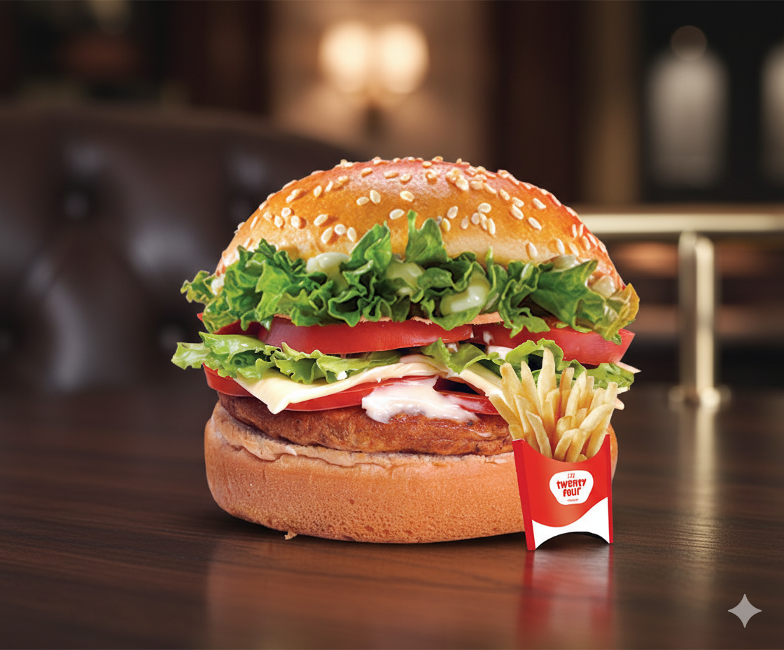 Prepared hot and fresh at Twenty Four Cafeteria, it’s full of taste and texture. Enjoy Chicken, Beef & Veg Burger with free delivery in Al Riffa, Al Jazeera Al Hamra, Mina Al Arab, and Marjan Island, served warm across Ras Al Khaimah.