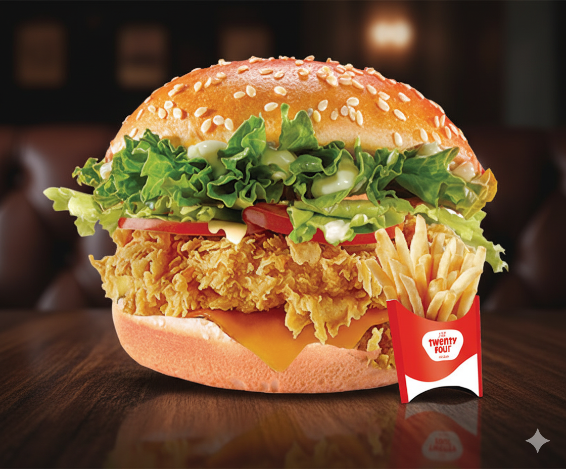 Prepared hot and fresh at Twenty Four Cafeteria, it’s a must-try for spice lovers. Enjoy Dynamite Zinger Burger with free delivery in Al Riffa, Al Jazeera Al Hamra, Mina Al Arab, and Marjan Island, freshly served across Ras Al Khaimah.