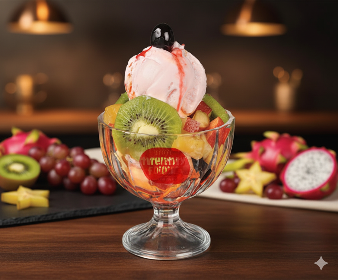 A chilled mix of fresh fruits topped with creamy ice cream — our Fruit Salad with Ice Cream is pure happiness in a bowl across Ras Al Khaimah!