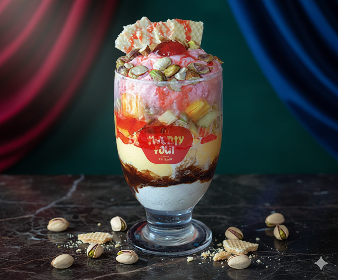 The Glory from Twenty Four Cafeteria is a dessert masterpiece layered with creamy ice cream, crunchy nuts, fresh fruits, and sweet syrups that blend into a perfect harmony of textures and flavors. Topped with pistachios, wafers, and a juicy cherry, every spoonful delivers a rich, chilled experience that feels luxurious and satisfying. It’s the ultimate treat for dessert lovers in Ras Al Khaimah! Enjoy free delivery to Al Riffa, Al Jazeera Al Hamra, Mina Al Arab, and Marjan Island, and let this colorful delight make your day truly glorious.