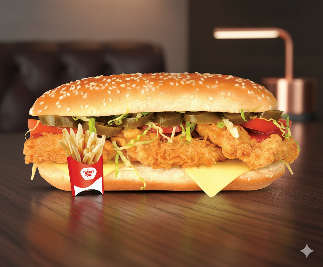 Taste the royal fusion of flavor with our Royal Mathafi Combo Sandwich, a creamy, spicy, and perfectly balanced creation. Made with juicy chicken fillet coated in our signature Mathafi sauce, layered with melted cheese, fresh veggies, and a hint of spice — all tucked between perfectly toasted bread. Each bite brings a rich blend of creaminess and crunch that makes this sandwich a truly regal experience, fit for food lovers who crave bold yet comforting taste.
