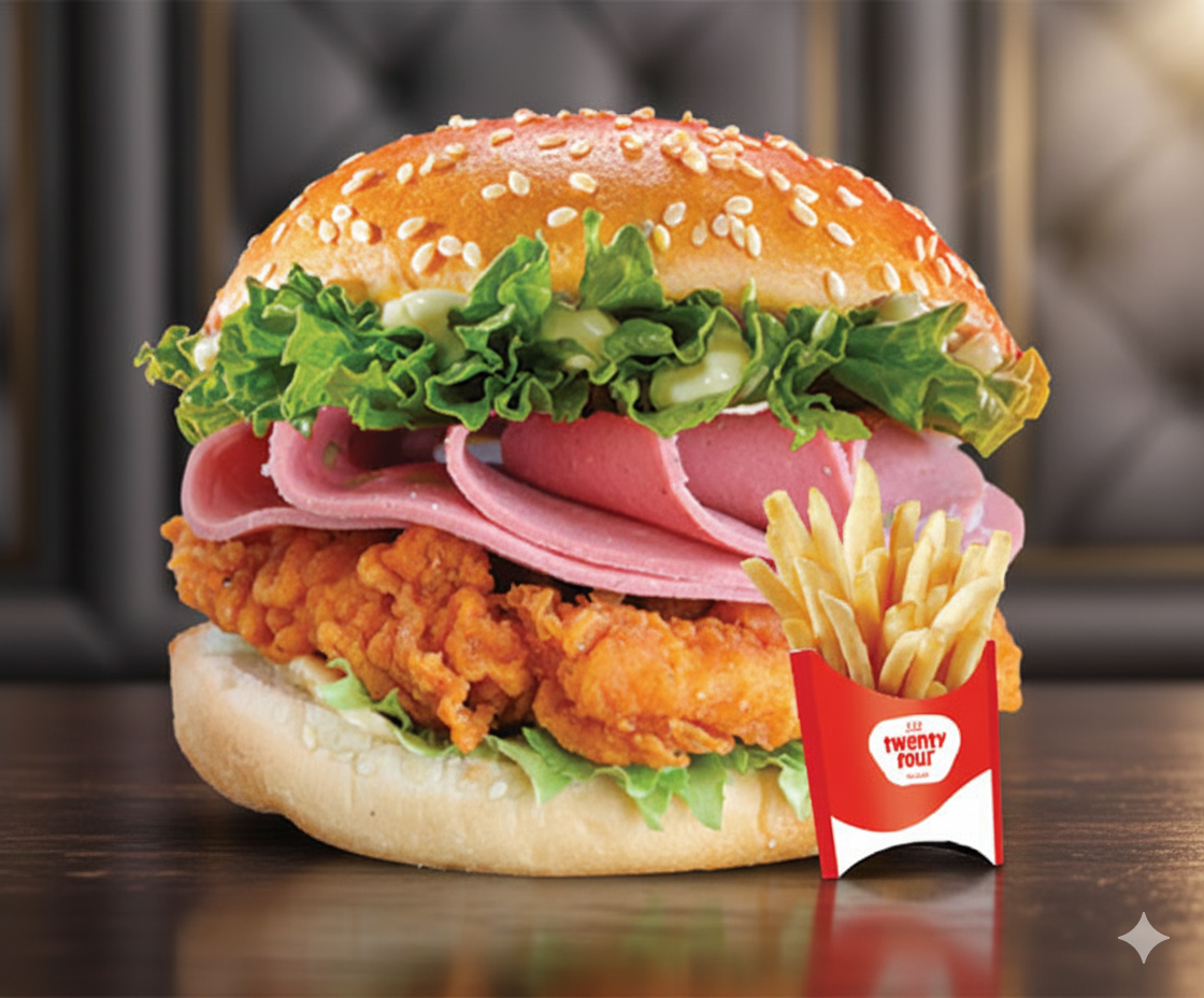 Prepared hot and fresh at Twenty Four Cafeteria, it’s a bite you’ll remember. Enjoy Turkey Zinger Burger with free delivery in Al Riffa, Al Jazeera Al Hamra, Mina Al Arab, and Marjan Island, freshly served across Ras Al Khaimah.