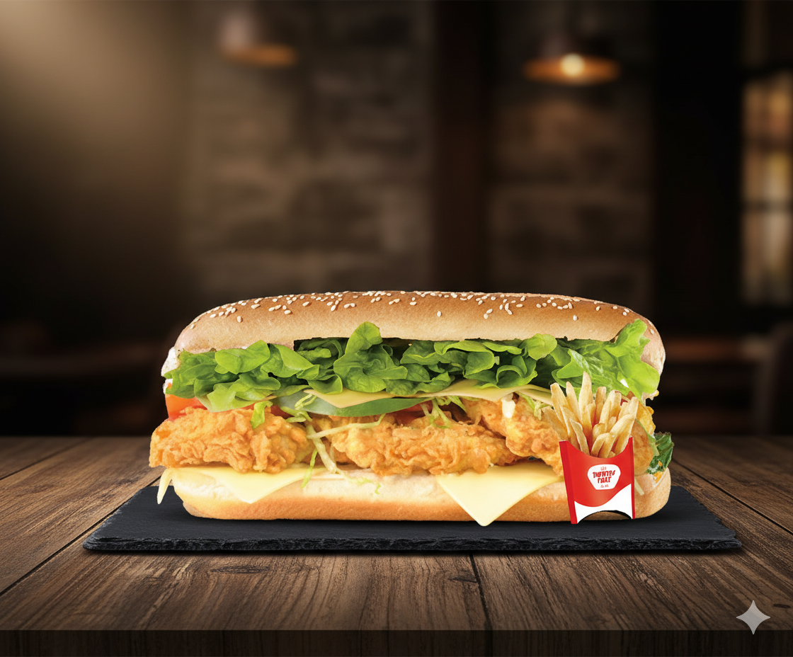 Crispy, juicy, and bursting with flavor — our Zinger Combo Sandwich is a crowd favorite that delivers pure satisfaction in every bite. Made with a crunchy zinger chicken fillet, melted cheese, creamy mayo, and a touch of spicy sauce, it’s layered with fresh veggies and toasted bread for that perfect crunch. The mix of heat, creaminess, and tenderness makes it a must-try meal that’s both hearty and delicious — a true comfort sandwich you’ll love.